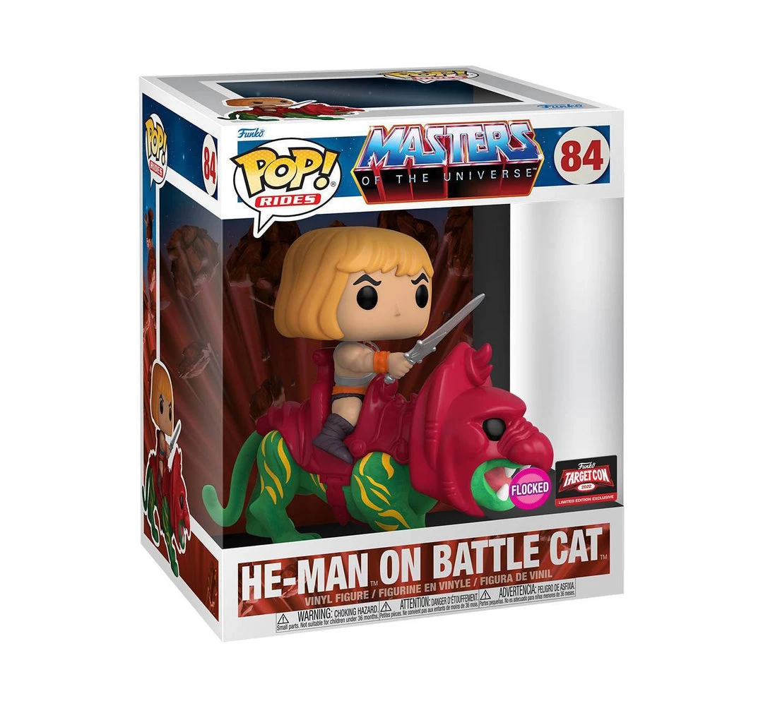 From the Masters Of The Universe Saturday television series comes this flocked He-Man on Battle Cat Pop! Ride Vinyl from Funko! This is a limited edition exclusive figure.