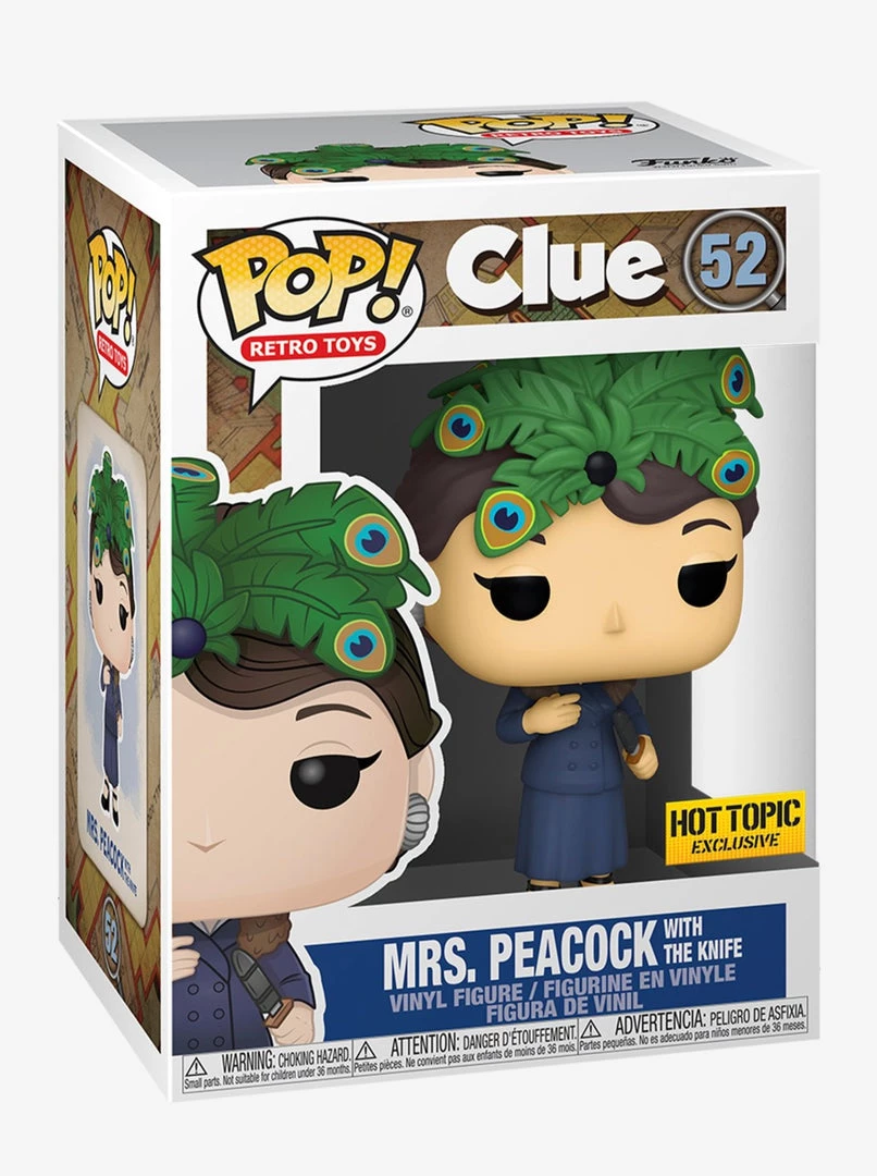 From the classic retro toys from the 80’s game CLUE comes this Mrs. Peacock (/w The Knife) Pop! Vinyl Figure! This is a limited edition exclusive figure.