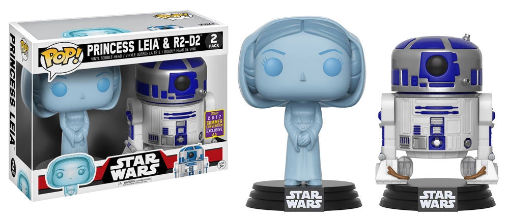 From the Star Wars movies comes this Princess Leia (hologram) and R2-D2 2-pack Pop! Vinyl Figure! This is a San Diego Comic Con 2017 exclusive, limited edition figure.