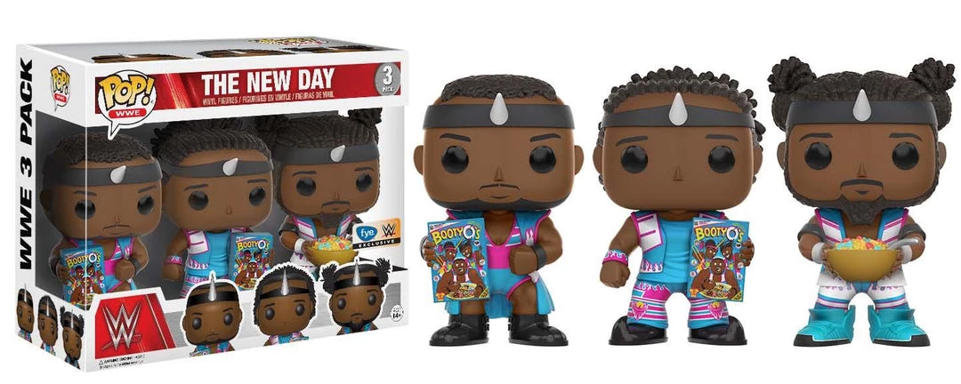 From the WWE comes this New Day 3-pack of Pop! Vinyl Figures from Funko! This is a limited edition, exclusive version of Xavier Woods, Big E, and Kofi Kingston in their sky blue tights WITH BOOTY-O’s.